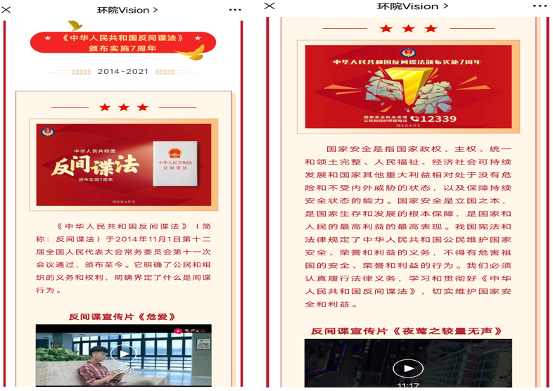 2021年11月1日是《中华人民共和国反间谍法》颁布实施7周年。为进一步提高全院师生维护国家安全及反间防谍意识,寸止挑战