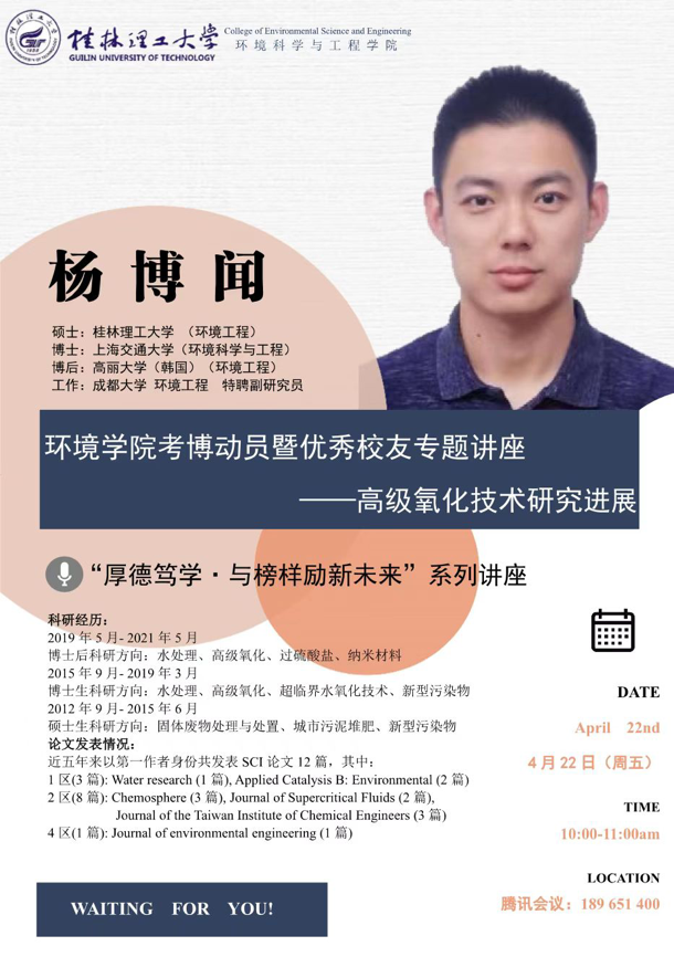 硕士学位,2019年毕业于上海交通大学获得博士学位,在博士期间以第一作者身份发表多篇SCI期刊,后前往韩国高丽大学从事博士后研究工作,现任成都大学特聘副研究员,他用自身的成功经历鼓励同学们不怕困难,继续追求更高的目标。随后,杨老师风趣幽默地向同学们分享了自己的考博经验,包括考博流程、复习准备等关键信息,并鼓励同学们把握机遇、积极考博。接着,耐心讲解介绍其博士与博后期间的研究课题——超临界水氧化,认真解答同学们提出的问题。最后杨老师基于同学们提出的问题,总结了几点关于考博的建议,一要早做准备,提高自身科研能力创新和英语阅读水平;二要量力而行,结合自身能力和目标选择深造高校;三要持之以恒,不怕念起,就怕觉迟,一旦决定就要全力以赴。