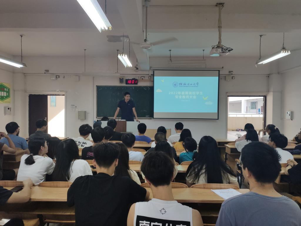 在雁山校区06401教室召开暑期留校学生安全教育大会,会议由学院党委副书记郝文佳主持,考研留校学生及相应辅导员参加会议。