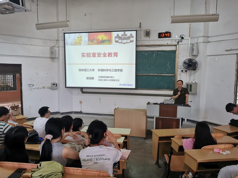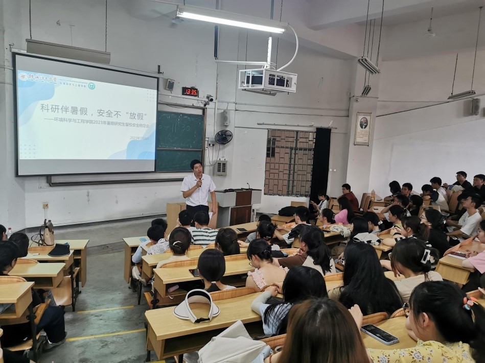 在雁山校区教5楼的05101阶梯教室召开暑期留校研究生安全教育大会,出席会议的有学院领导李艳红副院长、郝文佳副书记、梁延鹏主任、宋晓红副主任、环境工程中心实验室教师、以及暑期留校研究生,会议由郝副书记主持。