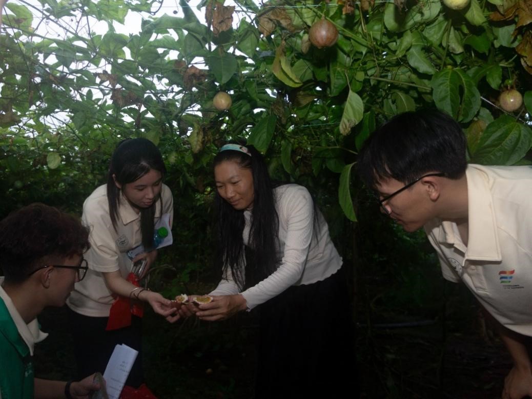 随后,成员们戴上手套,拿起剪刀,亲自参与到百香果的采摘工作中。天气炎热,百香果藤曼低矮,成员们均弯腰小心行走,虽腰酸背痛,但大家的学习和行动热情依旧高涨。他们穿梭在郁郁葱葱的百香果藤蔓之间,从识别成熟果实到小心翼翼地剪下,每一步都充满了探索与发现的乐趣。采摘之余,成员们还品尝了新鲜的百香果,那酸甜可口的滋味让他们赞不绝口,更激发了他们对农业产业的浓厚兴趣。经过一系列劳动,一颗颗百香果装满泡沫箱。