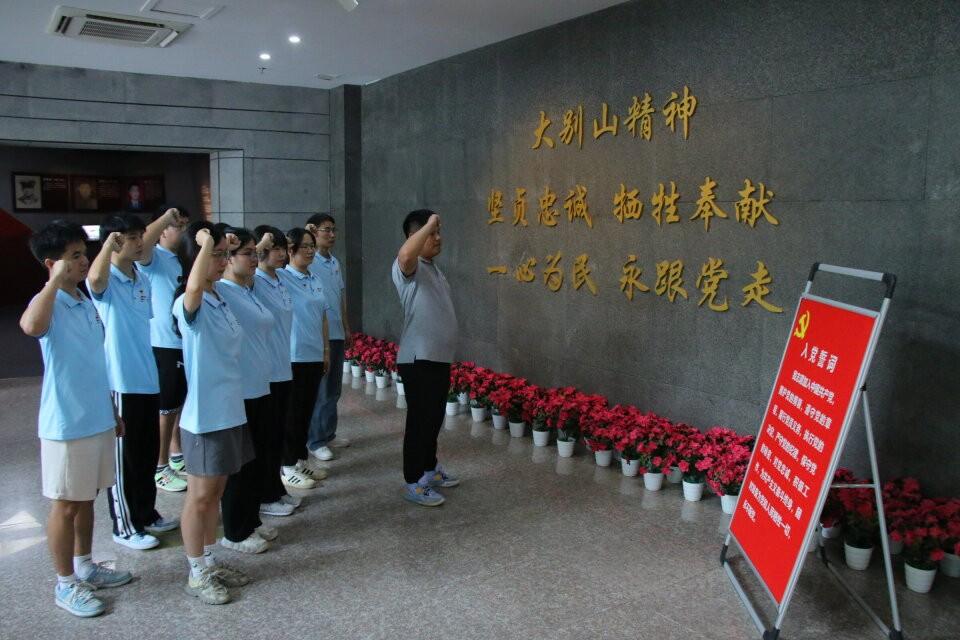 在展示馆工作人员的引导下,实践团成员依次参观了各个展厅。通过珍贵的历史照片、详实的文献资料以及丰富的实物展品,实践团成员们仿佛穿越时空,回到了那个波澜壮阔的革命年代。大家认真聆听讲解员的解说,不时驻足观看,交流心得。讲解员讲解完毕后,社会实践团中的党员们在大别山精神前进行了庄重的入党宣誓,更加坚定了社会实践团成员的理想信念。