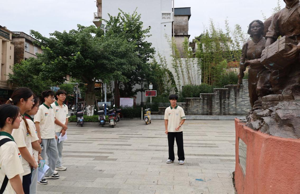 在宋墙遗址公园,实践团沿古城墙参观,结合讲解员介绍了解其作为古代钦州城防遗存的历史背景——墙体砖石见证历代先民抵御外侮、守护家园的历程。成员们驻足交流感悟,明确“守土有责”精神需当代青年接续传承;走进冯子材故居,实践团通过实物展品、图文资料及场景复原,系统了解抗法民族英雄冯子材的生平,重点聆听“镇南关大捷”事迹:年近七旬的冯子材率部浴血奋战,捍卫国家领土完整。在冯子材雕像前,成员们深切共鸣“保家卫国、寸土不让”的英雄精神;在广州会馆(钦州市红色文化地标),实践团了解到此处曾是革命志士秘密集会、传递情报的场所,通过老照片、文物感悟仁人志士为民族独立、人民解放奋斗的历程,明晰“爱国需以实际行动担当”的深刻内涵。