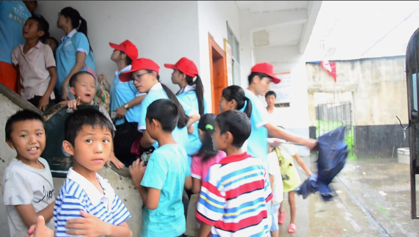 然而天公不作美,前一秒晴空万里的新街镇,后一秒却是倾盆大雨,这一突发状况让同学们措手不及。正当一些队员们犹豫是否要继续到村里支教时,接送同学们的三轮机车阿姨和同学们说道:“村里的小孩子很守时的,你叫他3点钟在那里等着,他们两点半就到了的。”