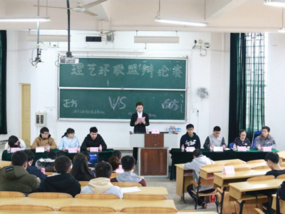 辩论不只是口才,不只是表达,更多的是思想的碰撞与交流。2017年3月11日下午3点,理艺环联盟辩论友谊赛第三轮在雁山校区05306教室火热进行中。艺术学院15级辩论队副队长栾天,辩论队主力任晓桐,陈文浩担任评委。寸止挑战