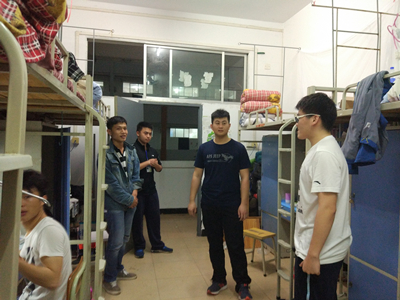 从本学期开始,积极组织全院宿舍长召开宿舍长例会,严抓宿舍环境卫生及安全隐患排查工作,经过大家的不懈努力,学院宿舍整体情况得到较大的改善。但在走访中发现还是有少部分同学在宿舍里没有注意卫生及用电安全,对此,田老师当面教育了这些同学及宿舍的宿舍长,宿舍是集体环境,构建文明校园,打造学习氛围浓厚、宿舍卫生环境良好的宿舍阵地是我们每一个环境学子应尽的义务,与此同时对于表现不好的同学,宿舍长及楼管委要有针对性地进行劝说教育,以提高宿舍卫生环境,提高寸止挑战
