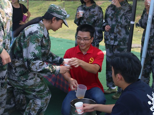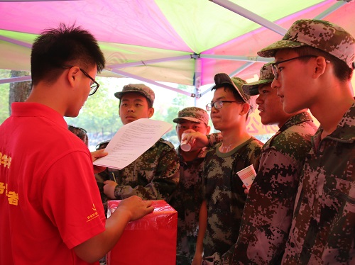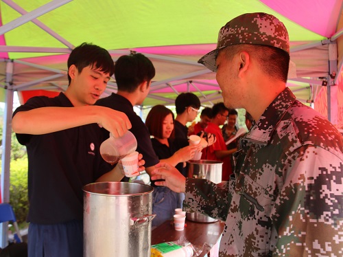 团委学生会和党建办公室的同学们前往军训场地,开展了”炎炎夏日送清凉,环院党员先锋行”的活动,为我们2017级新生及训练教官们送上了清凉可口的凉茶。在活动现场,凉茶和纯净水整齐地摆放在服务点。在军训休息期间,新生自带杯子,有秩序的排队来领凉茶,很快一桶桶凉茶就见底了。同时,党建办的同学还准备了许多有关党的知识问答,以及笔记本,小风扇等精美奖品。