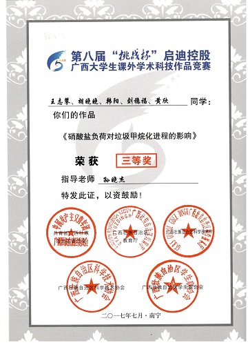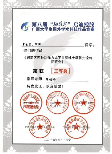 日前,共青团广西区委、自治区教育厅、科技厅、科协、学联联合下发《关于公布第八届“挑战杯”广西大学生课外学术科技作品竞赛结果的通知》(桂青联发【2017】20号),根据文件,寸止挑战 参赛作品《硝酸盐负荷对垃圾甲烷化进程的影响》获得三等奖,《岩溶区两种耕作方式下甘蔗地土壤优先流特征研究》获得三等奖。