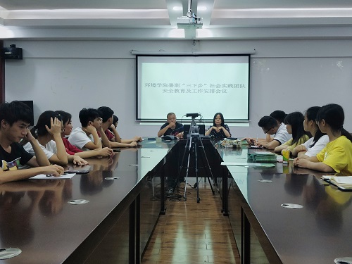 在萃华楼12407会议室召开2018年暑期“三下乡”社会实践团队安全教育及工作安排会议。出席会议的人员有学院16级辅导员夏晴老师、唐源江老师以及灌阳县大源村“科技助力扶贫·环保扎根乡村”社会实践团队成员。