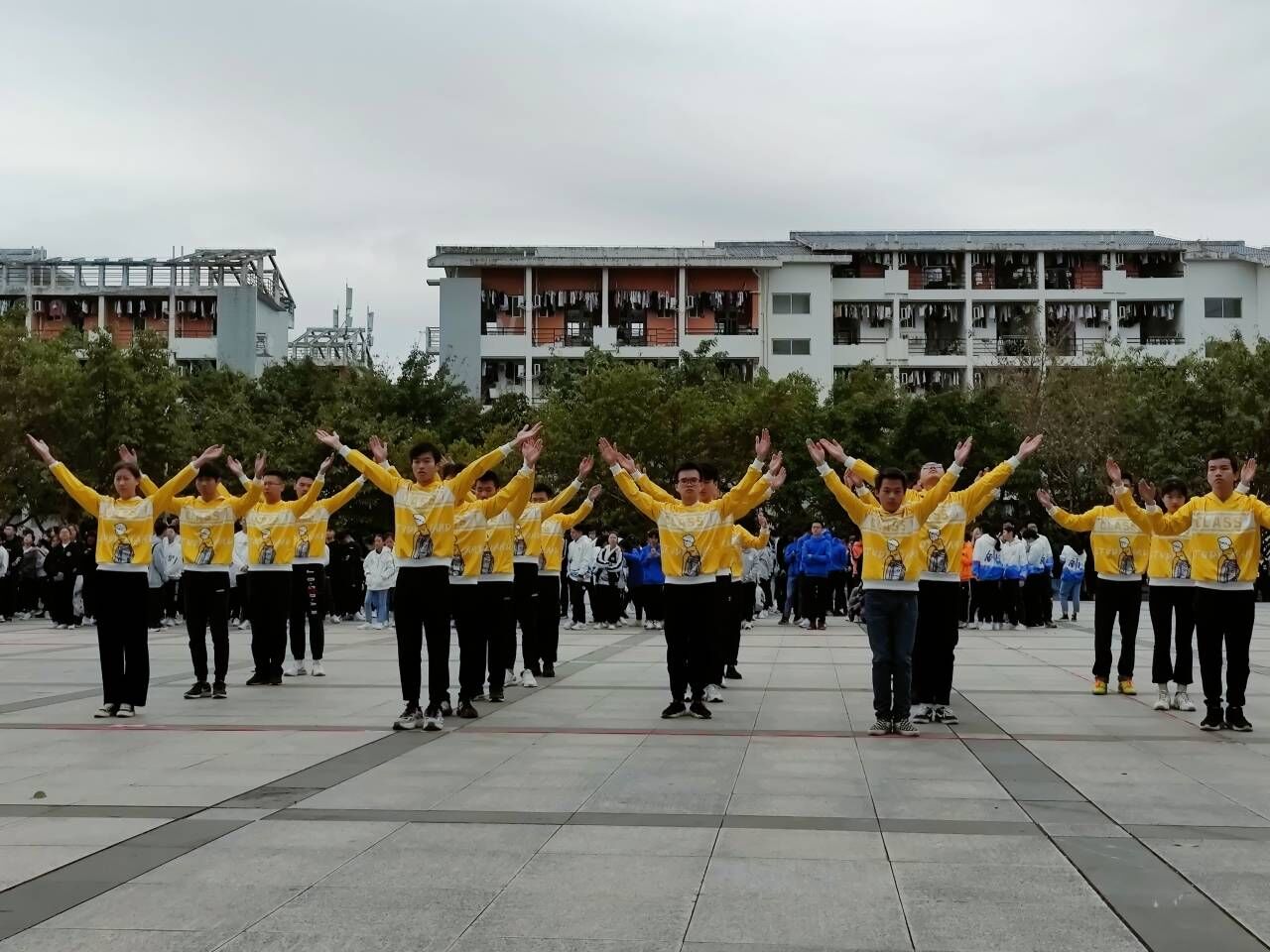 雁山校区三栋广场举办广播体操大赛。辅导员王媛、孙云龙老师出席比赛并担任评委。