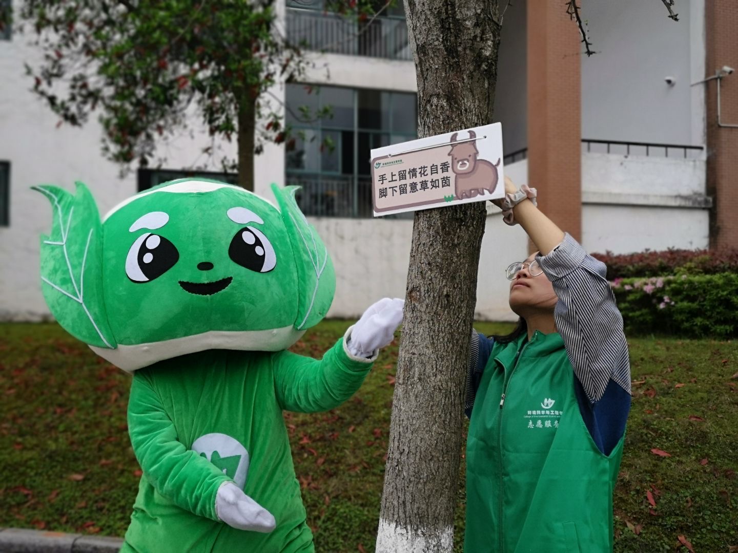 吉祥物——“环环”也与志愿者们一同悬挂标语。每个标语牌都醒目地呈现在同学们的必经之路,增强我校学生参与环保的自觉性,时刻提醒着桂工学子携手共护校园环境。最后,全体志愿者悬挂完标语牌后有序归还工具、志愿服后离开,工作人员进行后续工作并对本次活动进行总结。