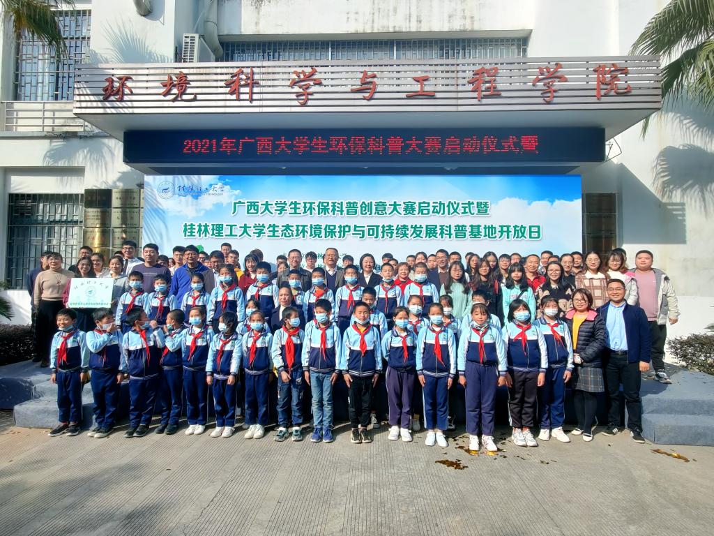 生态环境保护与可持续发展科普基地讲解员颁发聘书。学院党委书记姜子亮宣布广西大学生环保科普创意大赛启动仪式开始,领导嘉宾共同按动启动球,活动正式开始。随后,大埠中心学校师生在志愿者的带领下到达9栋清和楼进行参观,完成了各种精彩的实验活动和有趣的科普小游戏。学生们积极参与游戏,与志愿者、老师们互动,深刻地学习到了节能降耗、低碳环保、垃圾分类等相关知识。接着,学生们来到17栋生态环境保护与可持续发展科普基地,依次参观了生活垃圾综合处理与资源化利用智慧沙盘、物理性污染控制实验室、垃圾焚烧及废气处理仿真工厂、同层排水一体化水力系统等展厅。实验室老师以生动形象的例子讲解了污水的净水方式,让学生们能更清楚地理解污水处理与生态环境保护的关系。志愿者讲解员也详细介绍各个展厅里的实验流程,并现场演示大型净水机器的运转过程,学生们观察净水过程,切实感受到了科技环保的力量。最后一站来到了地质博物馆,师生们一同观赏了的恐龙化石模型,讲解员带他们了解古代生物,师生们感受到了保护生态环境的重要性。最后全体师生合影留念,圆满的结束了本次寸止挑战