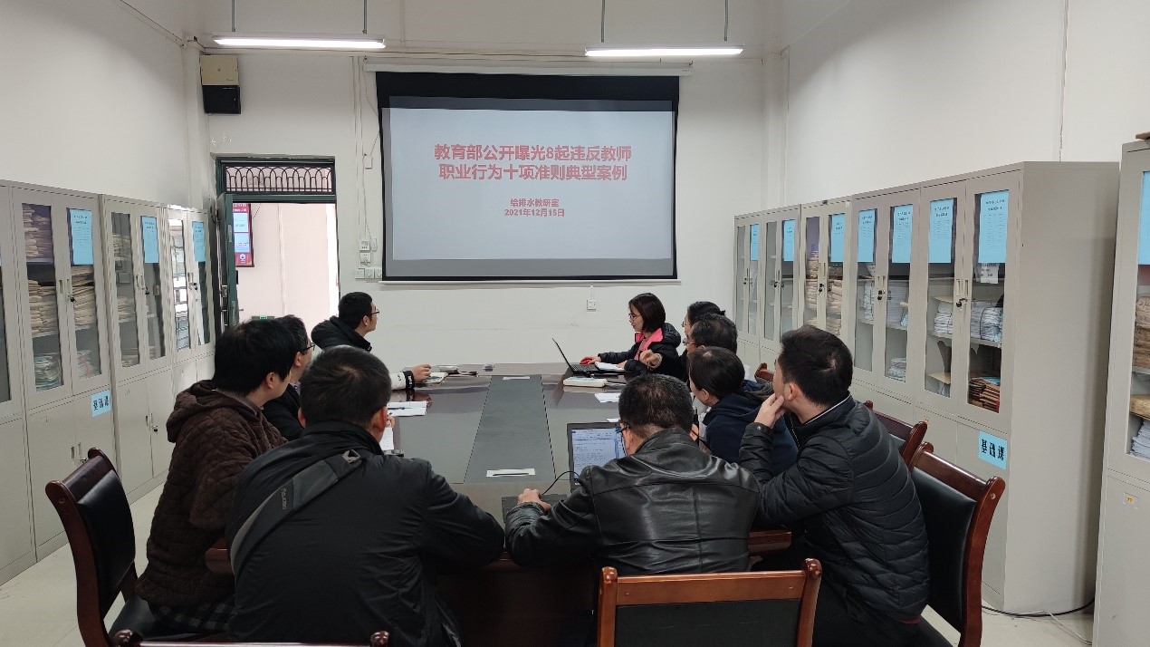 为巩固师德师风教育活动月的学习成果,进一步增强教师的责任感、使命感,进一步弘扬新时代高校教师道德风尚,同时响应学校号召,2021年12月,给水排水教研室组织师德师风教育专项系列学习活动,由徐宇峰主任带领,组织给水排水教研室全体教师学习《新时代高校教师职业行为十项准则》(以下简称《准则》)、《教育部公开曝光4起违反教师职业行为十项准则典型案例》以下简称《案例》)。