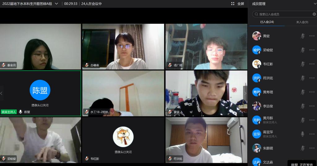 2022年4月6日晚上,地下水教研室组织了2022届本科生的开题答辩会议,受疫情影响,采用了钉钉会议网络答辩的方式。本次答辩有25名同学参加,邀请了6位评委老师,分为2个小组,蒋亚萍教授和夏源教授为组长,程亚平和胡荣庭老师分别担任秘书。