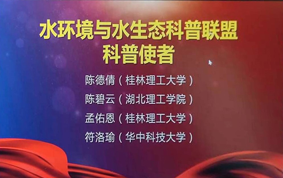荣获大赛“最佳组织奖”,许丹丹老师荣获“优秀指导老师”,孟佑恩、陈德倩同学被聘为“水环境与水生态科普联盟科普使者”。