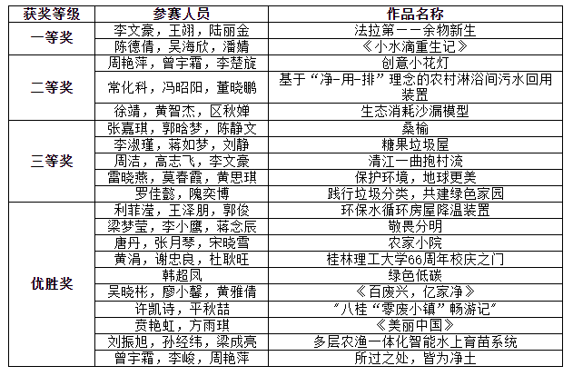 学生的热烈响应,还受到了信息科学与工程学院、公共管理与传媒学院、土木建筑与工程学院等全校多个学院学生的积极参与,充分调动了全校学生的积极性,同时激发出不同专业学生在环保领域的新观念、新方法和新技术,促进了各专业与环保理念的融合。各位评审老师根据作品的科学性、创新性和实用价值,共评出一等奖2组、二等奖3组,三等奖5组,优秀奖10组。具体获奖名单如下: