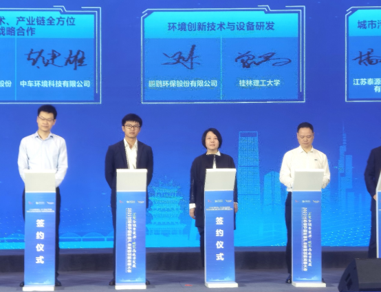 与鹏鹞环保股份有限公司作为校企合作代表,在环境创新技术与设备研发方面达成合作协议。曾鸿鹄院长与王鹏鹞总裁现场上台签约,我校王敦球校长、曲久辉名誉校长现场鉴签。