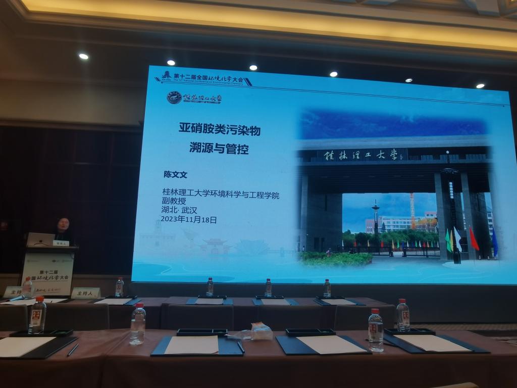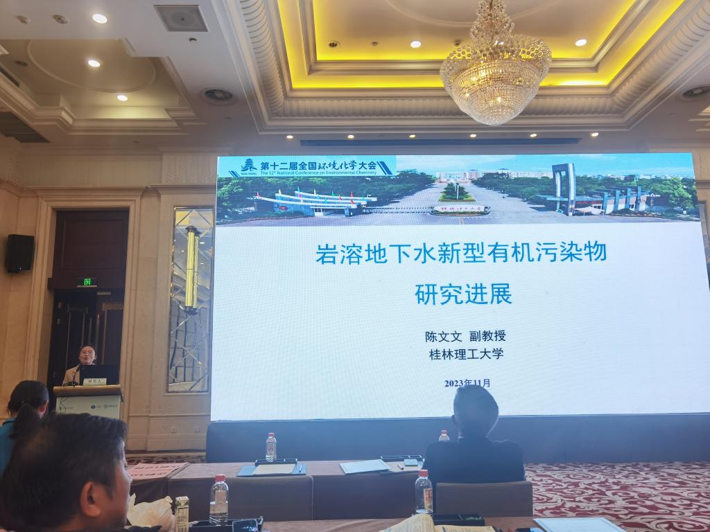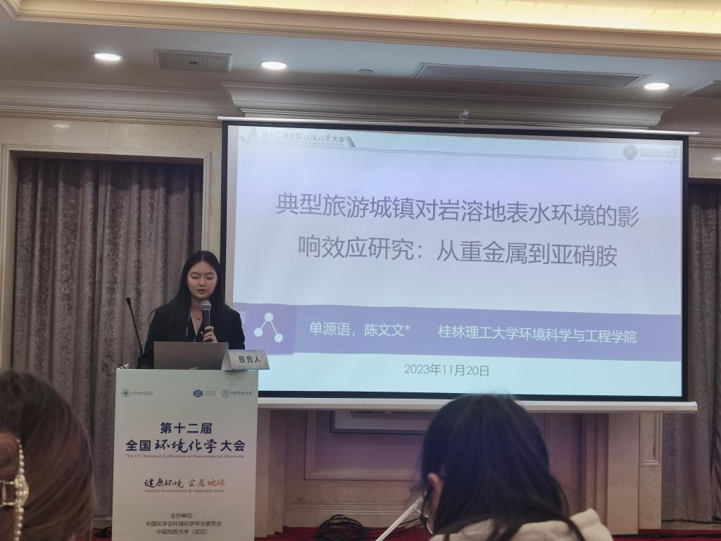 教师陈文文副教授分别在水污染溯源与管控和地下水污染与修复两个专题作了《亚硝胺类污染物溯源与管控》及《岩溶地下水新型有机污染物研究进展》的报告,研究生单源语在研究生专题作了《典型旅游城镇对岩溶地表水环境的影响效应研究:从重金属到亚硝胺》,向与会人员介绍和分享在新型有机污染物及岩溶地区新型有机污染等方面的研究,并和与会的环境化学领域专家交流。