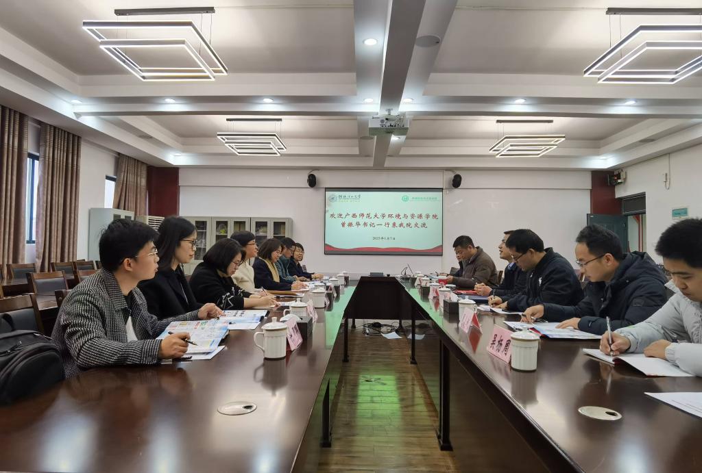 首先,代武社对广西师范大学环境与资源学院曾书记一行的到访致以诚挚的欢迎,并介绍了学院党建引领学科高质量发展的工作情况。随后,曾鸿鹄院长向客人介绍了学院基本情况,黄亮亮副院长介绍了学院一流学科及博士点建设工作的基本情况、朱宗强副院长介绍了学院实验室建设的基本情况,并分享了学院在实验室建设方面的经验与成果。同时,座谈会还围绕工程教育专业认证、专业建设、拔尖人才培养等方面进行了深入的交流与研讨。