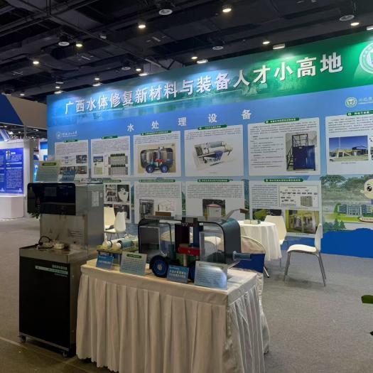 在水污染治理、资源循环利用等领域的创新成果。其中,“水处理功能材料”系列展板呈现植物遗态改性、复合活性、功能膜三大类创新材料,每款材料都通过电镜图、性能曲线和实物展示呈现完整研发链条。“水处理设备”系列展板则聚焦技术落地,展示涵盖城乡污水、工业废水、海水淡化等全场景的11类定制化装备,其中“外源厌氧氨氧化污水处理技术装置”因“零碳源添加、降本增效”成为咨询热点。