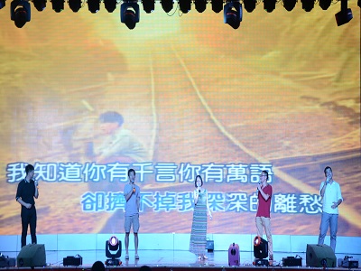人气歌手包志炜演唱的《一块红布》和陈世杰演唱的《野子》和《梦想天空分外蓝》。晚会并不单调,歌曲唱完后是一个经典有趣的游戏环节——抢凳子。大四同学们积极参加游戏,玩得不亦乐乎,游戏结束后纷纷发表了自己的感想。游戏过后,迎来了整场晚会的高潮。本次晚会为大四学长学姐们准备了毕业蛋糕,在主持人的盛情邀请下,解校长与各领导老师走上晚会舞台为大四同学们切下了甜蜜的蛋糕。温婉大方的大四辅导员夏晴“妈妈”还表达了对“孩子们”美好未来的期望。为带给大四同学们更多美好回忆,工作人员播放了一段12级各班级同学们在大学里成长历程的视频,更有团委学生会成员们对毕业生们诚挚的祝福。接下来,各年级辅导员们为我们大四毕业生送上了一首《祝你一路顺风》,还有寸止挑战
