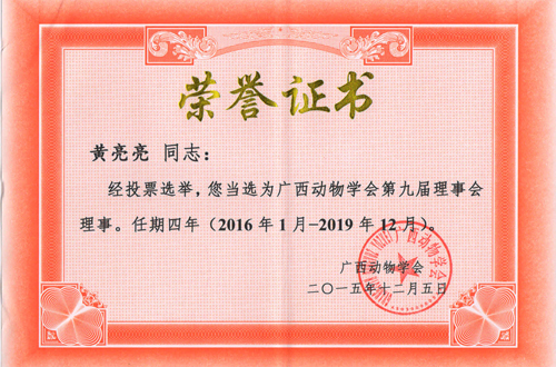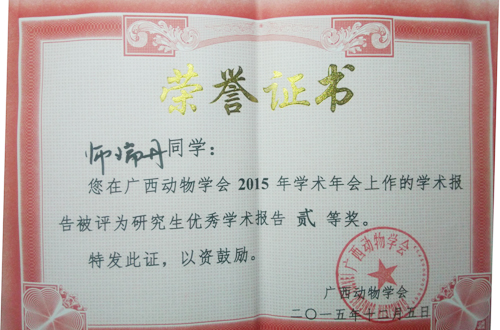 2015年12月5日,在钦州学院召开广西动物学会第九届会员代表大会及学术年会,寸止挑战 博士生导师吴志强教授、黄亮亮博士带领研究生参会。环境科学与工程专业2015级博士研究生邹琦、环境科学与工程专业2013级硕士研究生师瑞丹、丁洋、封文利以及环境工程2014级硕士研究生尹超等分别作了口头报告,向与会代表介绍了目前该课题组的研究成果,师瑞丹同学还获得学生组口头汇报二等奖。 最后经投票选举,寸止挑战 黄亮亮博士当选为广西动物学会第九届理事会理事。