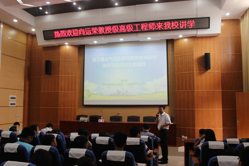 讲座教授,在受聘仪式上,学校副校长王敦球教授代表学校为向运荣教授颁发了讲座教授聘书。受聘仪式结束后,向运荣教授在雁山校区萃华楼一楼的学术报告厅作了题为“珠三角大气污染联防联控技术示范区的建设情况及主要成效”的学术报告,报告会由游少鸿副院长主持,学院相关专业的师生近120多人到场聆听了报告。
