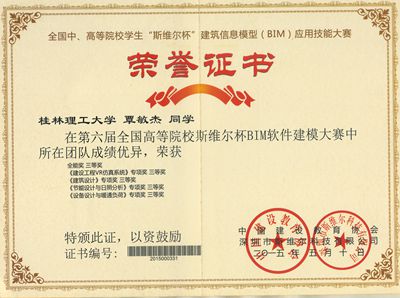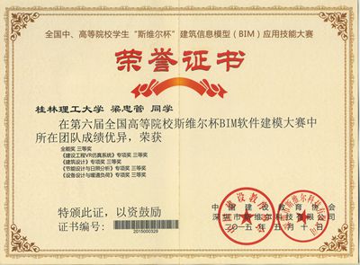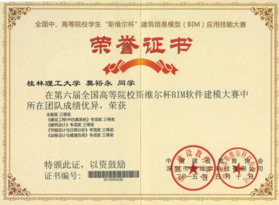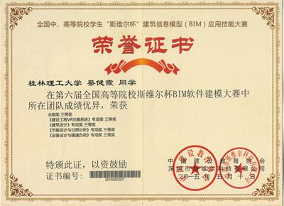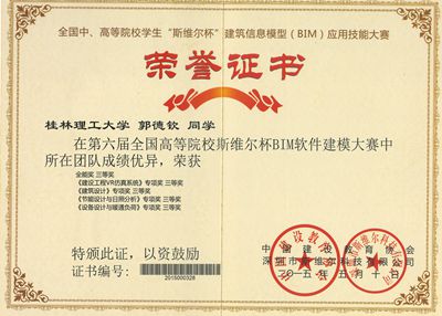 2012级给排水科学与工程专业学生组成的“创新”队参加了于2015年5月9-10日举行的第六届全国中、高等院校学生“斯维尔杯”建筑信息模型(BIM)应用技能大赛决赛。获得了4个专项(建筑工程VR仿真系统、建筑设计、节能设计与日照分析、设备设计与暖通负荷)三等奖,1个全能三等奖的好成绩。