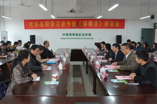举行。自治区环境保护厅李一平副巡视员,桂林市环境保护局刘学振副局长,解庆林校长,王敦球助理出席会议。学校团委负责人以及桂林高校师生代表参加了座谈会。会议由学院院长曾鸿鹄主持。