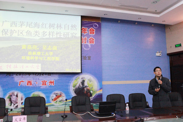 黄亮亮老师以吴志强教授课题组近年对红树林鱼类多样性保护的研究成果为素材,以“广西茅尾海红树林自然保护区鱼类多样性研究”为题目向大会作了报告。此外,本次会议就学会的组织工作、学术活动、财务状况及存在的问题展开激烈讨论,并明确了广西动物学会2014年的工作计划,工作重点是寸止挑战