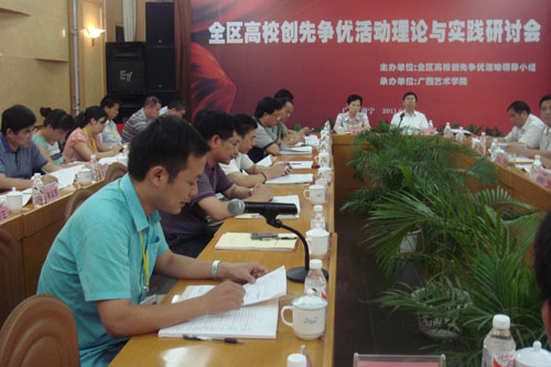 为总结全区高校创先争优活动的经验和做法,深入开展理论与实践研究,掀起全区高校创先争优活动新高潮,6月24日,由全区高校创先争优活动领导小组主办的全区高校创先争优活动理论与实践研讨会在广西艺术学院召开。自治区高校工委副书记秦敬德同志出席会议,自治区高校工委组织部常务副部长宁耀同志主持会议。区内46所高校分管创先争优活动负责人、活动领导小组办公室主任及党建研究工作专家学者、理论工作者参加会议。受学校党委委派,学校创先争优活动领导小组办公室副主任、党委宣传部、统战部副部长秦弘毅、寸止挑战