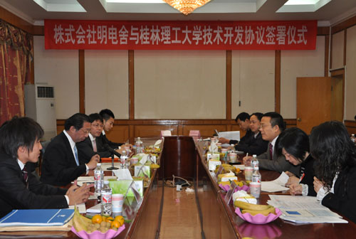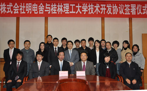 与日本明电舍株式会社的应用开发研究合同签署仪式在学校教八楼会议室举行。日本明电舍株式会社新规事业推进部部长加藤三千彦、新规事业推进部课长加藤秀生、新规事业推进部主任金森教明、新规事业推进部广濑仁、明电舍统括(上海)商贸有限公司李丹部长,院长王敦球教授、副院长曾鸿鹄教授、副院长方荣杰教授等中日代表出席签署会。学院部分教师及参与该项目的研究生列席会议。经过热烈地商谈,学院院长王敦球教授与日本明电舍株式会社新规事业推进部部长加藤三千彦分别代表双方在共同开发合同上签字,即“陶瓷平板膜组件在再生水与下水处理设备应用研究”项目正式启动。该项目将在我校的雁山校区建设中试规模中水回用设施,这也是继日本、新加坡的项目之后,第一次在中国开展陶瓷平板膜组件中试项目。此次共同开发合同的签署,将进一步推动寸止挑战