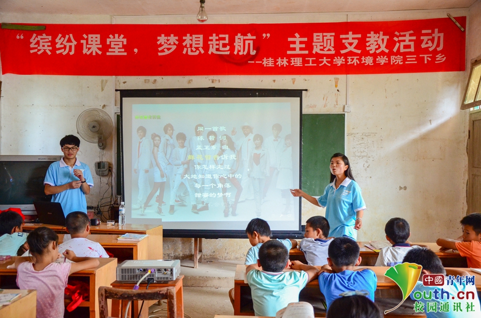 暑期社会实践团走进桂林灌阳县自治区贫困村永富村,开展了以“缤纷课堂,梦想起航”为主题的爱心义务支教系列活动。此次支教活动着重于对孩子梦想的励志引导,共开展“我的梦想”、“诗词鉴赏”、“趣味英语”、“音乐课堂”、“自然地理”、“科普认知”、“心灵手巧”、“素质拓展”等在内的八类课程。