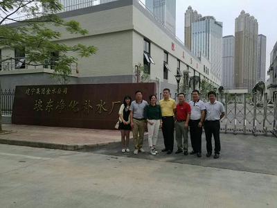 副院长游少鸿、李艳红和给排水教研室副主任李海翔一行来到广西建宁集团金水公司琅东净化补水厂调研。广西建宁集团副总经理何刚、广西建宁集团金水公司董事长韦海涛和其他公司高管接待来访。琅东净化补水厂是南宁市第一座污水深度处理提标净化厂,毗邻主要景观生态河道竹排冲贤宾湖西北岸河道旁,占地面积约1.30公顷,处理规模为35万m3/d。该厂通过深床滤池过滤、微砂高速沉淀、紫外线消毒等技术,对琅东污水处理厂出水进行深度处理,使水质达到一级A排放标准,为南宁市主要河道之一的竹排江水系提供了洁净的景观用水,改善了竹排江水系及其下游民歌湖水体的水环境,是南宁市大力建设“中国水城”的重要工程,也是推进国家海绵城市试点建设的主要组成部分。