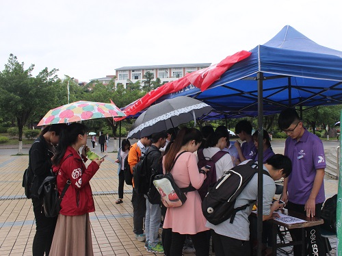 一株株小巧的盆栽出现在桂工校园中,迅速吸引了不少同学的围观。“快看那边,好多绿植哎!“,“咦?那是什么活动?我们一起去看看呀!”活动现场涌现出许多这样的声音。由此不断聚集的同学先后扫描二维码,领养属于自己的绿植。