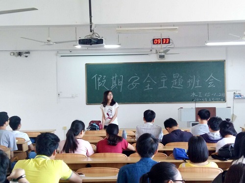 会议主要内容包括:一、严格落实假期离校登记制度,合理安排外出行程,按时返校;二、保持手机通畅,保持与老师、同学、家人的联系;三、假期留校同学要注意防火、防盗,需要前往市区购买生活用品时要告知宿舍其他同学或者班委,尽量结伴同行,尽早返回学校;四、禁止下河下江游泳;五、注意饮食安全,不要去不正规的摊点就餐。