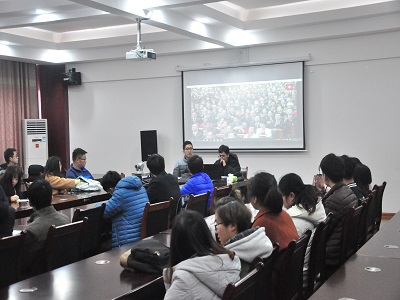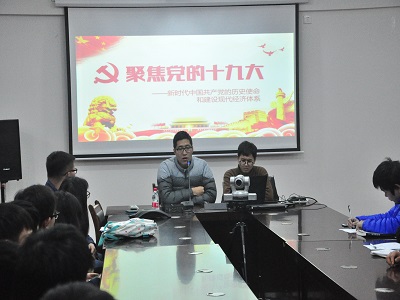 在雁山校区萃华楼12407会议室展开学习党的十九大精神辅导员“校园宣讲”、“网络巡礼”活动,并由学院党委副书记郝文佳同志作了题为《新时代中国共产党的历史使命和化建设现代化经济体系》的第一讲报告,寸止挑战
