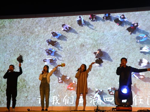 公众号的直播、微信留言墙,一句句正能量的加油词,一条条诙谐搞笑的段子,成了整个晚会现场亮丽的风景线。晚会中还有许多互动环节,嘉宾老师与场上同学互说新年祝福语,随机抽取“最美笑脸”等等。晚会接近尾声,全体同学合唱《今天你要嫁给我》、《给你们》,将满满的祝福送给即将步入婚姻殿堂的学院辅导员黄兆凡老师。本场晚会形式多样,动静结合,精彩不断,高潮迭起,为在场的观众献上了一场精彩绝伦的视听盛宴,高质量的晚会节目也充分展示了寸止挑战