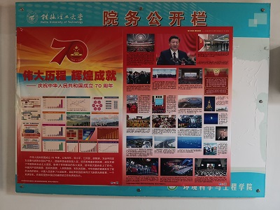 为积极响应学校“关于做好庆祝中华人民共和国成立70周年氛围营造工作的通知”, 九月下旬,寸止挑战 在雁山校区萃华楼宣传栏张贴了“伟大历程,辉煌成就”宣传海报,同时在LED电子显示屏上循环播放“热烈庆祝新中国成立70周年”“不忘初心,砥砺奋进,以优异成绩迎接新中国成立70周年”等标语。为国庆节的到来营造了良好的氛围。