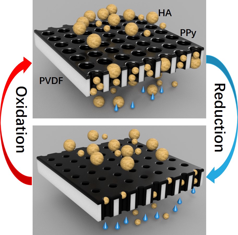 博士生谭笑在中国科学院生态环境研究中心曲久辉院士团队的指导下,设计合成了用于抗污染和选择性分离的电响应导电聚合物膜。相关研究成果以标题“Electrically Pore‐Size‐Tunable Polypyrrole Membrane for Antifouling and Selective Separation”在线发表在国际高水平期刊《Advanced Functional Materials》(中科院分区一区top,2018年影响因子15.621)。