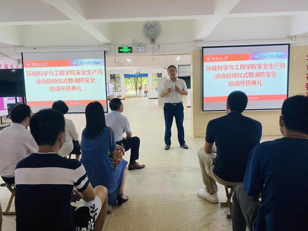 在教8栋负一楼“安全教育基地”举行安全生产月活动启动仪式暨消防安全培训班开班典礼。学校党委常委、副校长王敦球,学院党政领导班子,各教研室、实验室教师代表及学院研究生、本科生学生代表共计80余人参加活动,活动由学院党委姜子亮书记主持。
