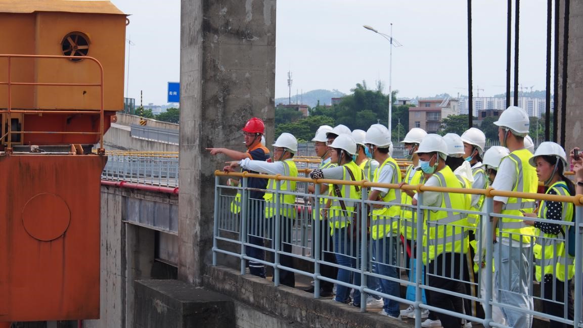 师生一行。进行实地参观学习之前,曹主任介绍了参观学习的安全需知,并要求所有参观人员穿戴好安全警示马甲和安全帽。首先,参观了长洲水利枢纽的鱼道设施,鱼道设施全长1443.301米,由下游进口段、鱼道鱼池、观测室、挡洪闸段、上游出口段和诱鱼设施等组成。吴志强教授现场重温了课堂知识并强调鱼道建设对鱼类多样性保护的重要性。其次,参观了长洲水利枢纽的船闸设施,吴志强教授为同学们讲解船闸过船原理,并结合船闸实际运行情况对同学提问,同学们踊跃发表自己的想法。最后,参观了中控室吴志强教授就西江水利枢纽分布图向同学们强调水利枢纽建设的重要性。