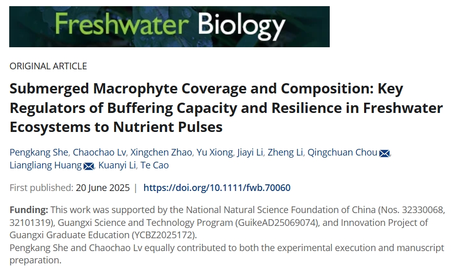近日,在生态学知名期刊《Freshwater Biology》上发表了题为"Submerged Macrophyte Coverage and Composition:Key Regulators of Buffering Capacity and Resilience inFreshwater Ecosystems to Nutrient Pulses"的研究论文由我校寸止挑战