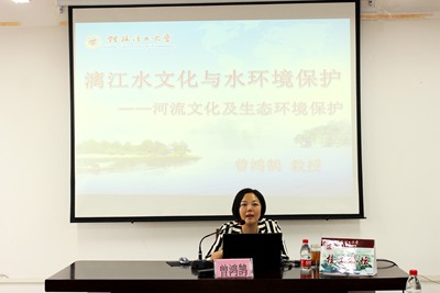 于雁山校区12407会议室举办桂工讲坛,学院院长曾鸿鹄教授作了主题为“漓江水文化与水生生态保护”的讲座,环工实验班和给排水专业学生近百人到场聆听。