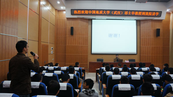 祁士华教授一进场就以一阵幽默风趣语言引来现场阵阵掌声。接着,他通过各种图表及案例对我国目前的能源利用现状进行讲解,与世界能源结构对比分析我国应开发的新能源种类及优势。引用并指出开采我国陆域干热岩地热能资源的2%,即可满足我国2010年全年总能源需要的4400倍。介绍了课题组在广东省地热资源勘探的阶段性研究成果:详细给出远红外遥感、地热地质调查、水文地球化学调查、重点区区域地质测量、岩浆岩、大地热流值钻孔、物探工作、推荐新洲地热田作为地热科学钻探靶区和靶区部分工作等介绍,对控热地质构造综合研究、地热水文地质综合研究、千米地热勘探孔综合研究和干热岩预研究的研究方法、研究成果进行了阐述。在互动环节,祁教授对师生们提出的问题进行了解答。