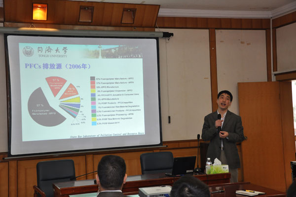 做了题为《全氟有机物的污染及其处理技术》的学术讲座。周教授就目前使用最广泛的全氟有机酸(全氟辛酸PFOA、全氟辛烷基磺酸PFOS)之污染源、排放、减排处理、目前世界前沿研究方法及其本人研究进展进行了详细阐述。