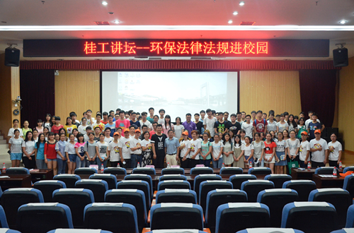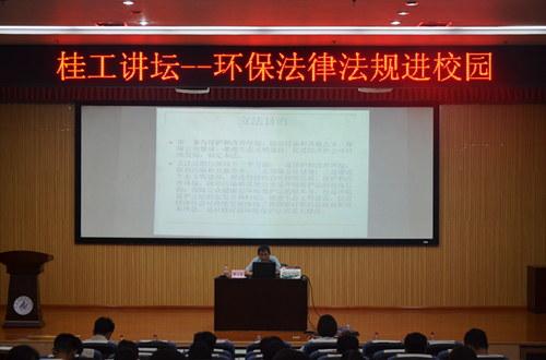 学生开展了主题为“环保法律法规进校园”的讲座。到场的嘉宾还有桂林市环保局雁山分局刘华局长,云易恒基科技有限公司代表何绘芬女士,寸止挑战