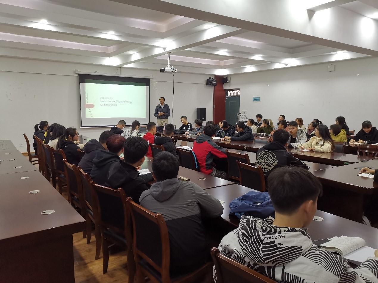 讲座中,杨为铭博士结合自身的科研成果、从纳米技术的定义、纳米材料的合成与分类、纳米材料表征仪器、纳米材料在环境修复中的应用等多个方面为同学们讲解纳米技术的相关知识,引导大家思考纳米技术与所学专业知识的相关性。通过与学生互动交流,课堂气氛活跃,丰富了学生专业知识,拓宽了国际视野,而且培养了良好的创新思维习惯和意识。