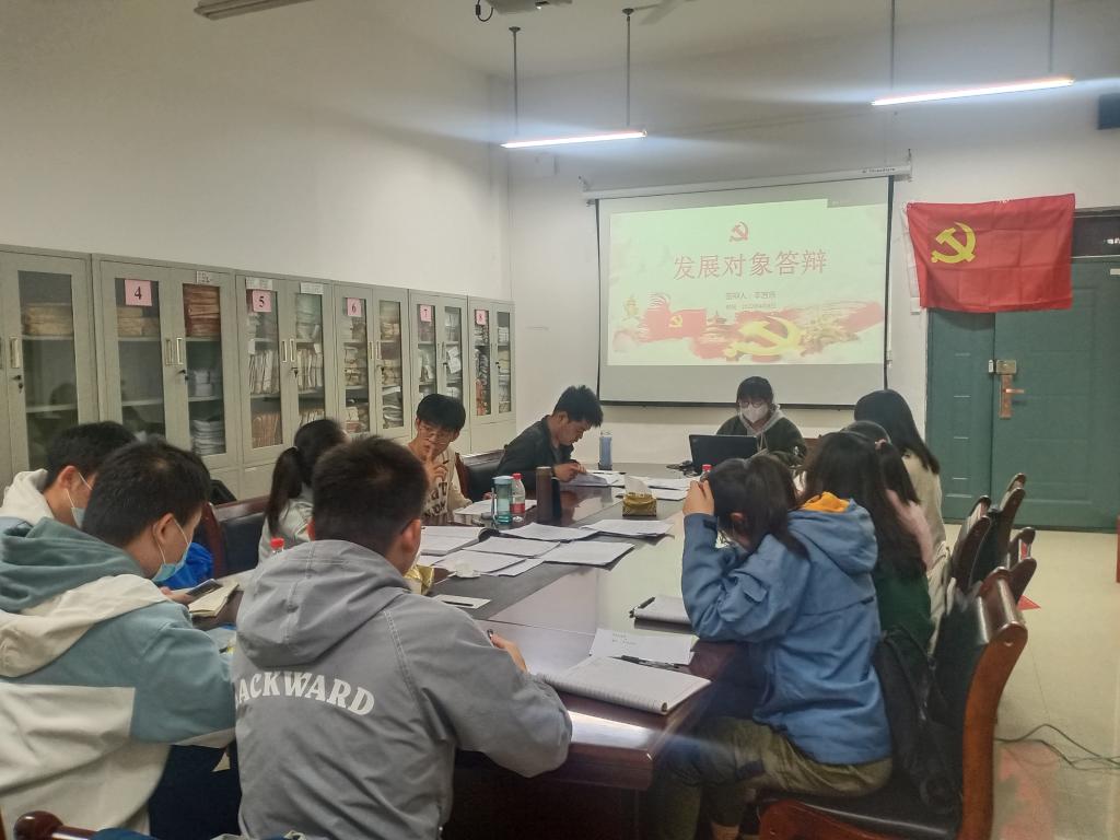 会议开始,韦春伊同志介绍了此次答辩流程,强调了本次会议对于支部发展新一批党员有重要作用。接着,本次进行答辩的十位同志依次就个人基本情况、党性认识、入党动机等方面进行陈述,现场和线上党员根据他们的陈述情况并结合其个人实际进行相关理论知识的提问,进一步考察了十位同志对党的认识、党的基本知识和时事热点的掌握程度。本次答辩中,部分同志从容冷静、思维清晰,体现出了良好的党性修养与较高的思想觉悟,但也有少数同志存在对党的理论知识的掌握不足的情况。而后,支部党员根据十位同志的答辩情况进行无记名投票,初步确定了本学期党员发展对象名单。最后,支部书记孙云龙老师对本次会议进行总结,他对各位同志积极向党组织靠拢的决心给予了肯定,同时也指出了十位同志在答辩过程中对党的理论知识的掌握欠缺的问题,强调了深入学习党的理论知识的重要性,希望能激励同志们进一步明确入党初心,及时认识自身存在的问题与不足,主动学习,积极思考。