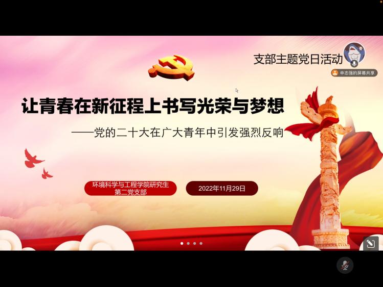 研究生二支部组织开展了以学习“党的二十大在广大青年中引发强烈反响”为主题的党日活动,本次党日活动采取线上交流的形式。支部书记及支部全体党员同志参加会议,本次党日活动由支部副书记主持。